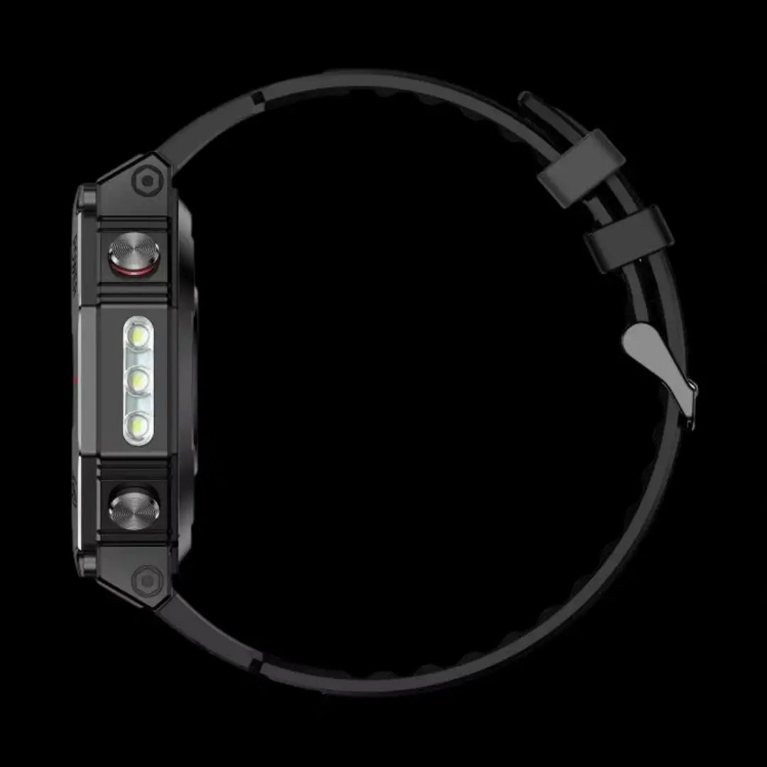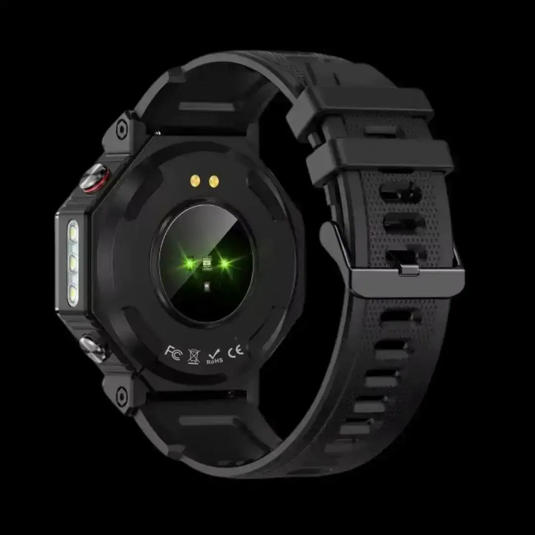 Con el Militar Pro 9k GPS, estar preparado para cualquier situación es parte de su esencia. Incorpora una linterna táctica de triple LED, diseñada para ofrecer una iluminación potente y versátil en todo momento. Cuenta con 4 modos de uso: modo SOS en caso de emergencia, luz baja para ahorrar batería, luz alta para máxima visibilidad y luz intermitente como señal de alerta. Ya sea en una caminata nocturna, un corte de luz o una situación inesperada, basta con un gesto para activar la luz desde tu reloj y tener claridad al instante, estés donde estés.